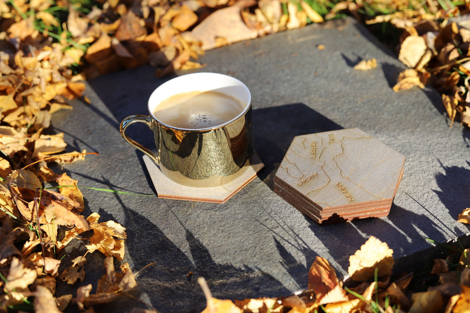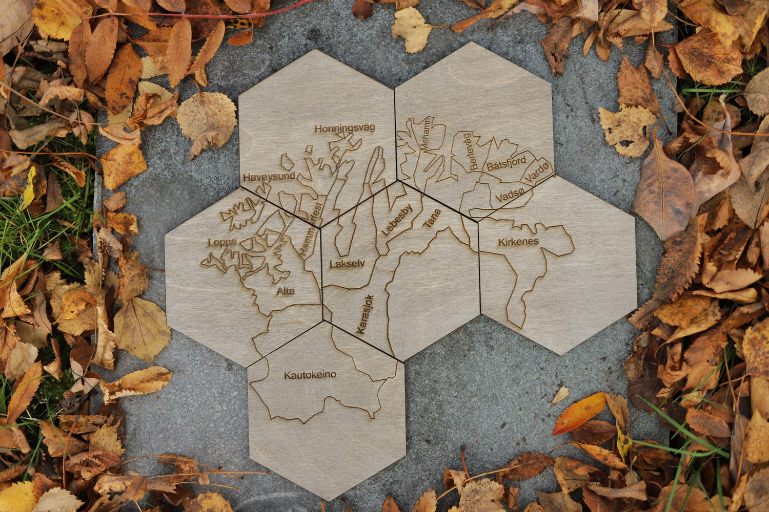 Dekorativ bordbrikker med kart over Finnmark.